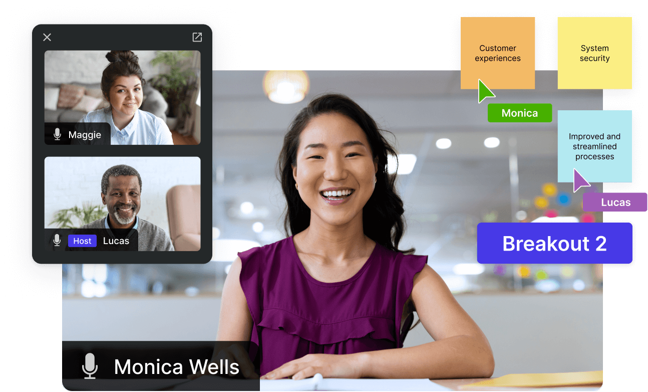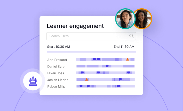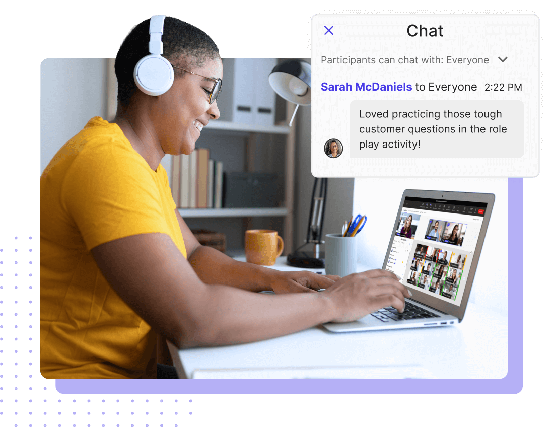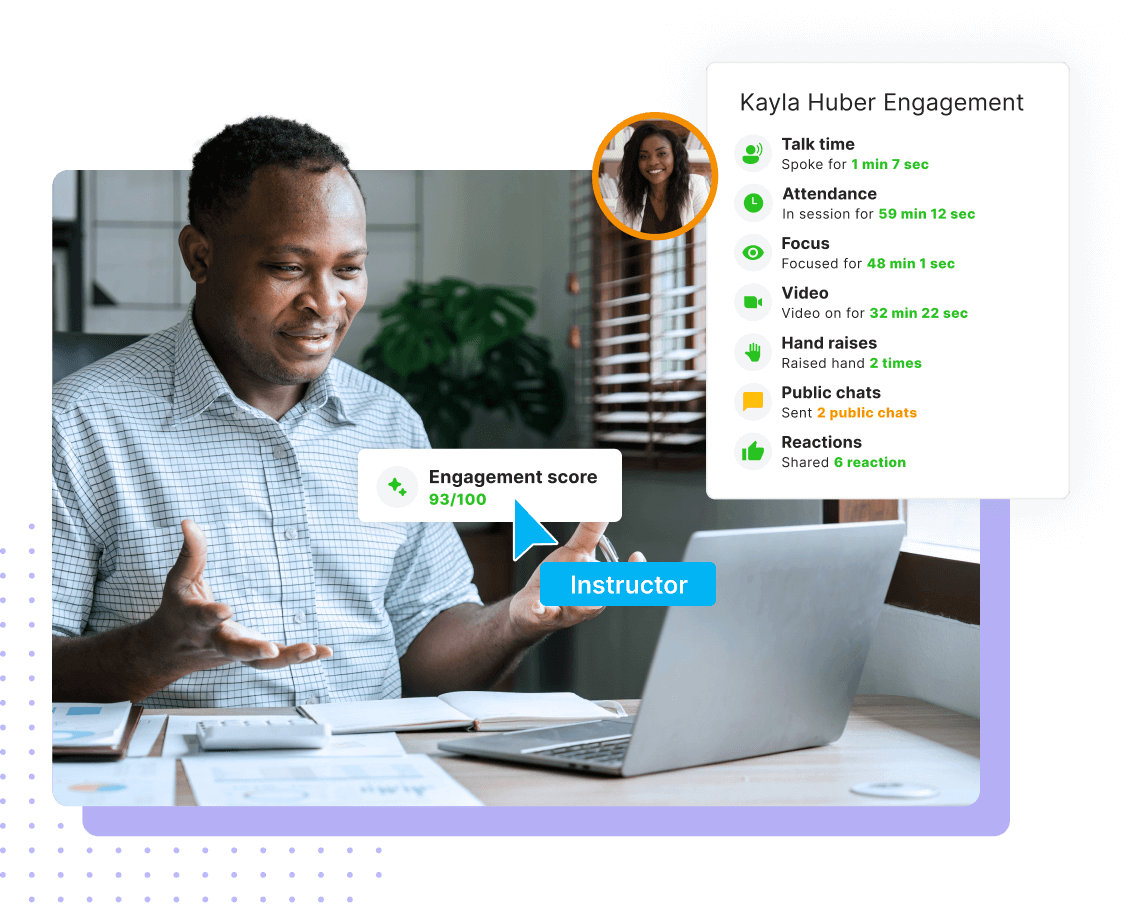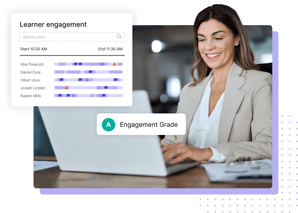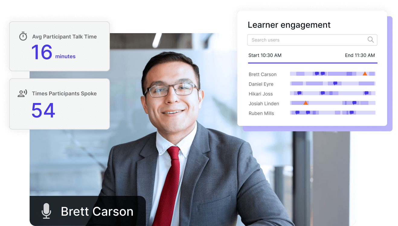 Generic meeting tools lead to passive, “camera-off” experiences that make it hard to keep learners involved. Deliver more than passive learning with collaborative whiteboards, flexible breakouts, and live engagement tracking. Deliver interactive, hands-on learning clients expect and learners remember.